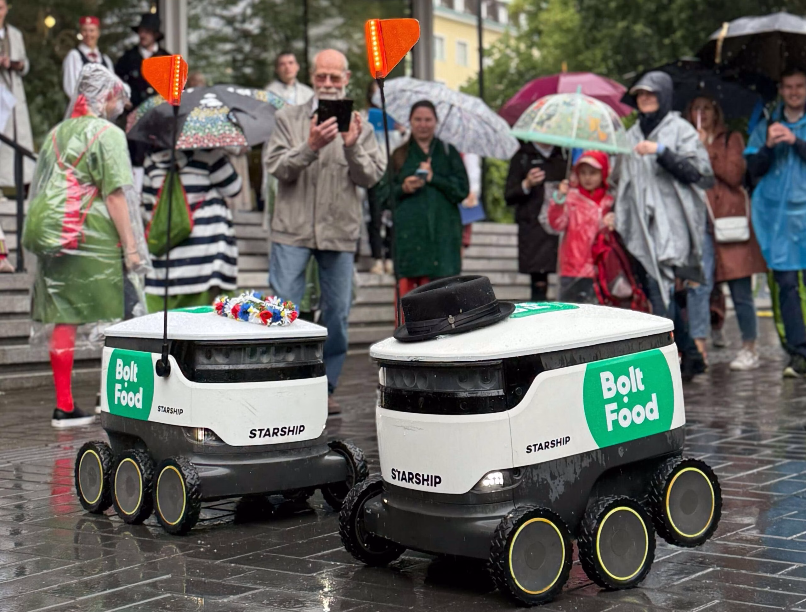 Even heavy drizzle couldn’t dampen the mood in Tallinn last weekend – neither for the thousands of people celebrating Estonia’s beloved Song and Dance Festival, nor for the pair of Starship delivery robots who joined in.